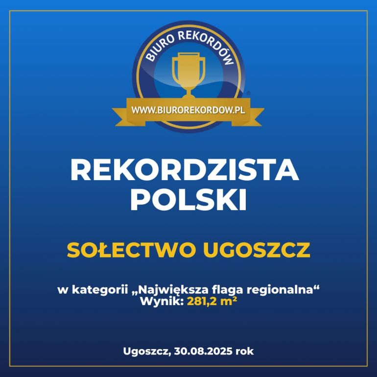 Zaledwie 3 tygodnie czekali organizatorzy bicia rekordu na najdłuższą flagę regionalną w Ugoszczy na potwierdzenie nowego rekordu Polski w tej kategorii. Przypomnijmy, że uszyta przez panie z KGW Ugoszczanki czarno-żółta flaga mierzyła 95 m i miała prawie 3 m szerokości.