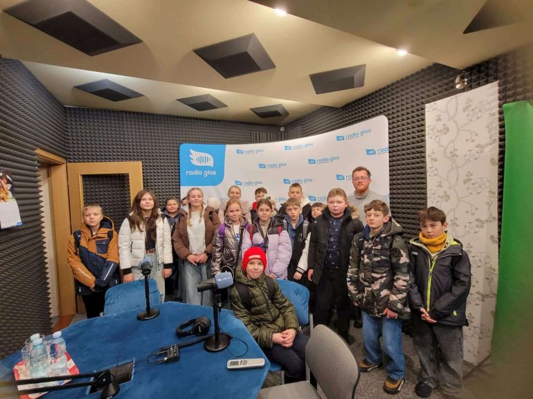 Podczas wizyty młodzież miała okazję zobaczyć m.in., jak wygląda praca w Radiu Głos „od kuchni” – od przygotowania audycji, przez obsługę sprzętu, aż po prowadzenie programu.